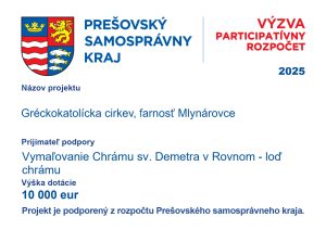V júni 2025 sa nám podarilo s výraznou pomocou Prešovského samosprávneho kraja vymaľovať steny lode chrámu v Rovnom. Celková investícia bola 12 949,44 eur. Z výzvy Participatívny rozpočet sme dostali 10 000 eur.